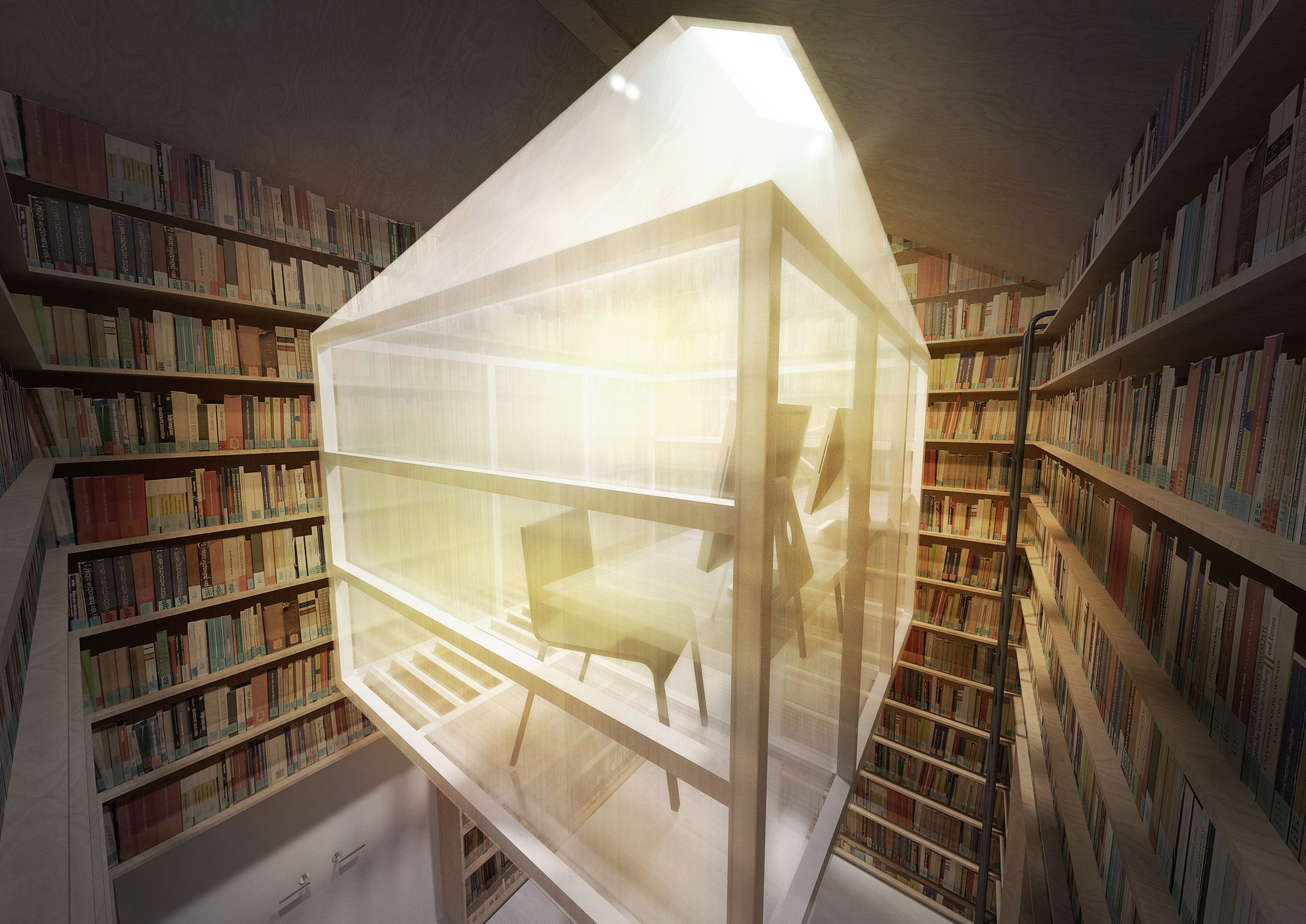 Hlavním tématem úprav bytu na Bořislavce je vstupní hala. Původně tmavá hala se stává velkorysou knihovnou, do které je vložen nový objem pracovny. Pracovna je zavěšena na konstrukci krovu a skrze svůj průsvitný plášť ozařuje jako lucerna celý prostor knihovny.