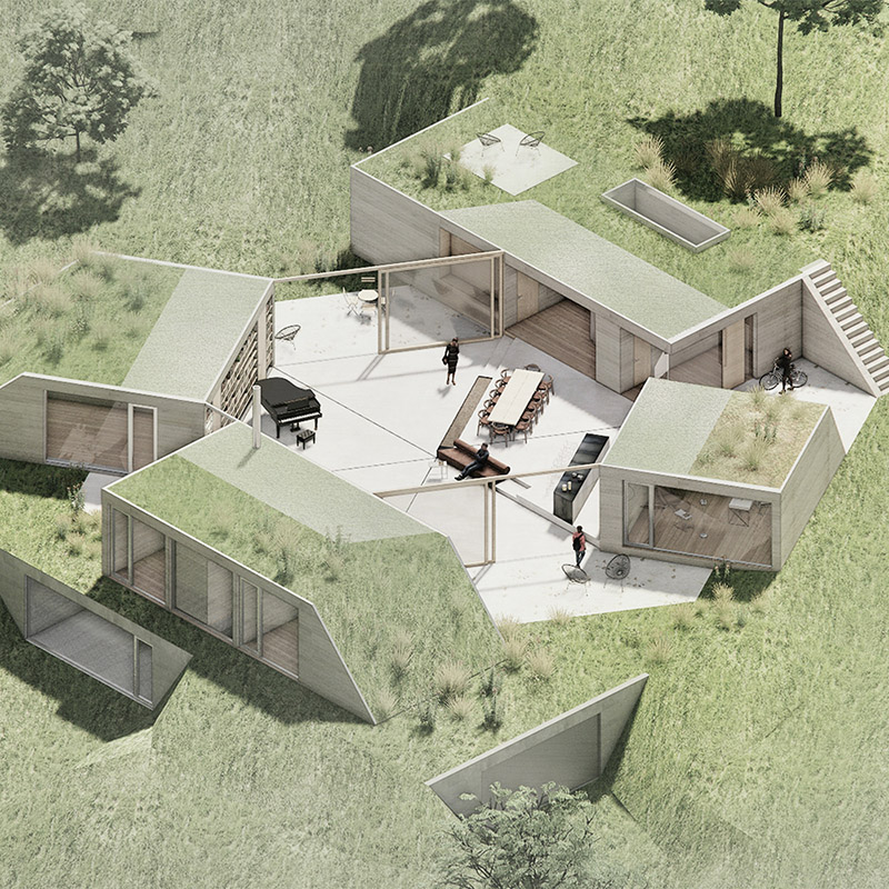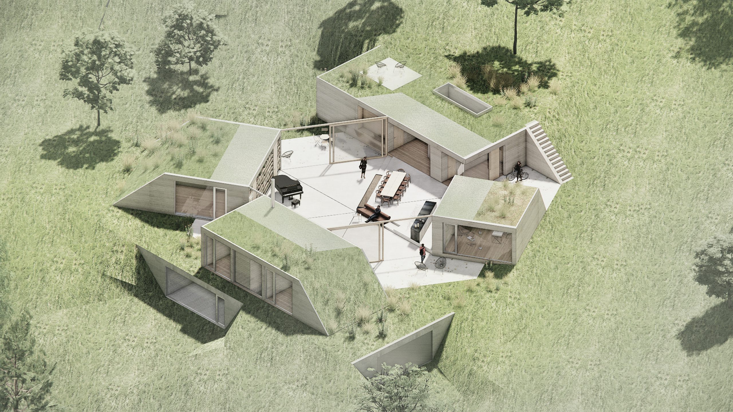 Koncept. Koncept domu je založen na vytvoření silného centrálního obytného prostoru – „náměstíčka“ – který je těžištěm života jeho obyvatel. Prostor je komponován jako hexagon a po jeho obvodě jsou navěšeny jednotlivé krabičky s různými funkcemi. Geometrie šestiúhelníku umožňuje vytvářet rozmanité výhledy do okolí a zároveň drží rozlehlý dům pohromadě svou specifickou konstrukční logikou.