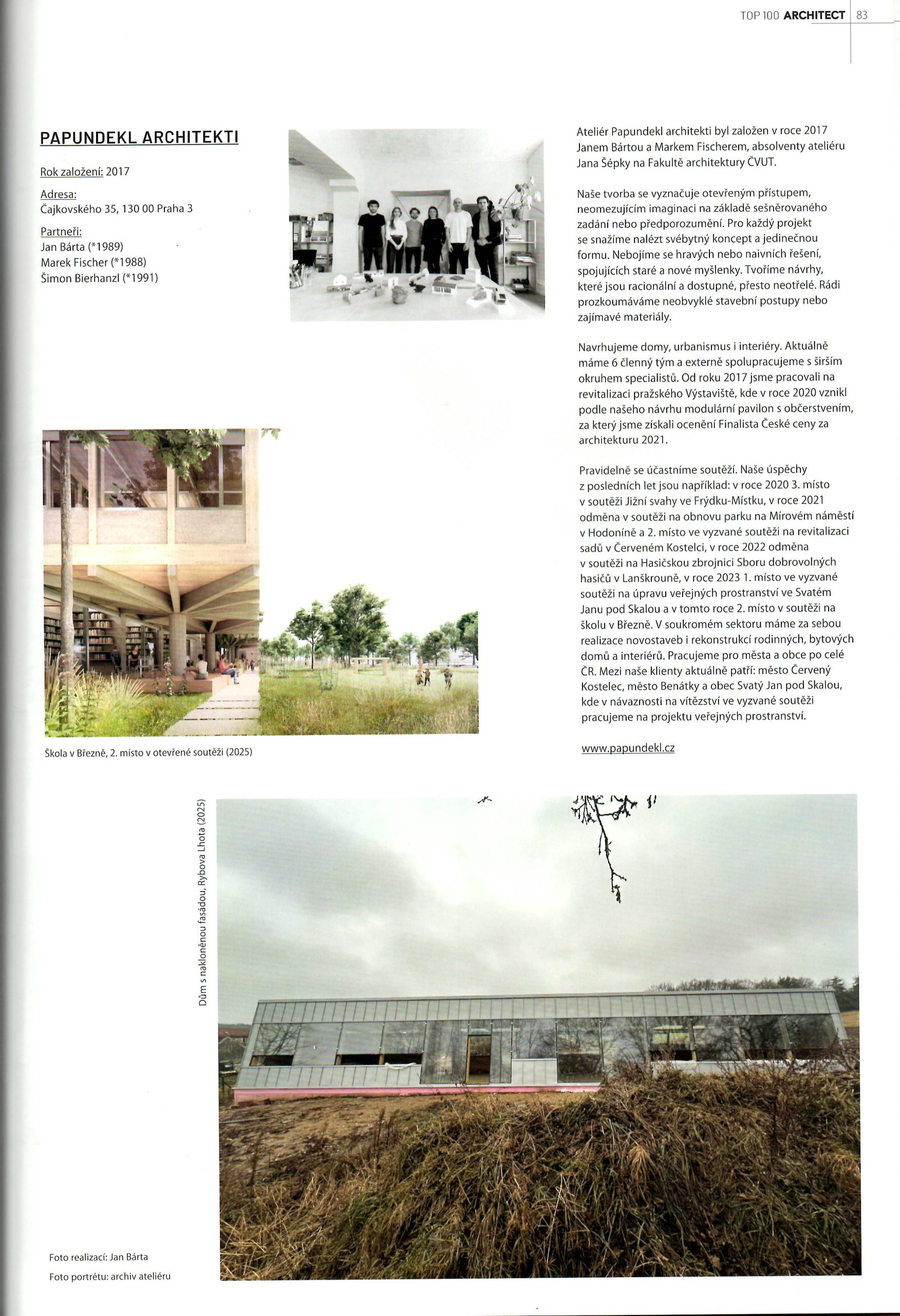 Ve výběru TOP 100 architektonických kanceláří v ČR / Rybova Lhota RD a 2.místo v soutěži na školu Březno