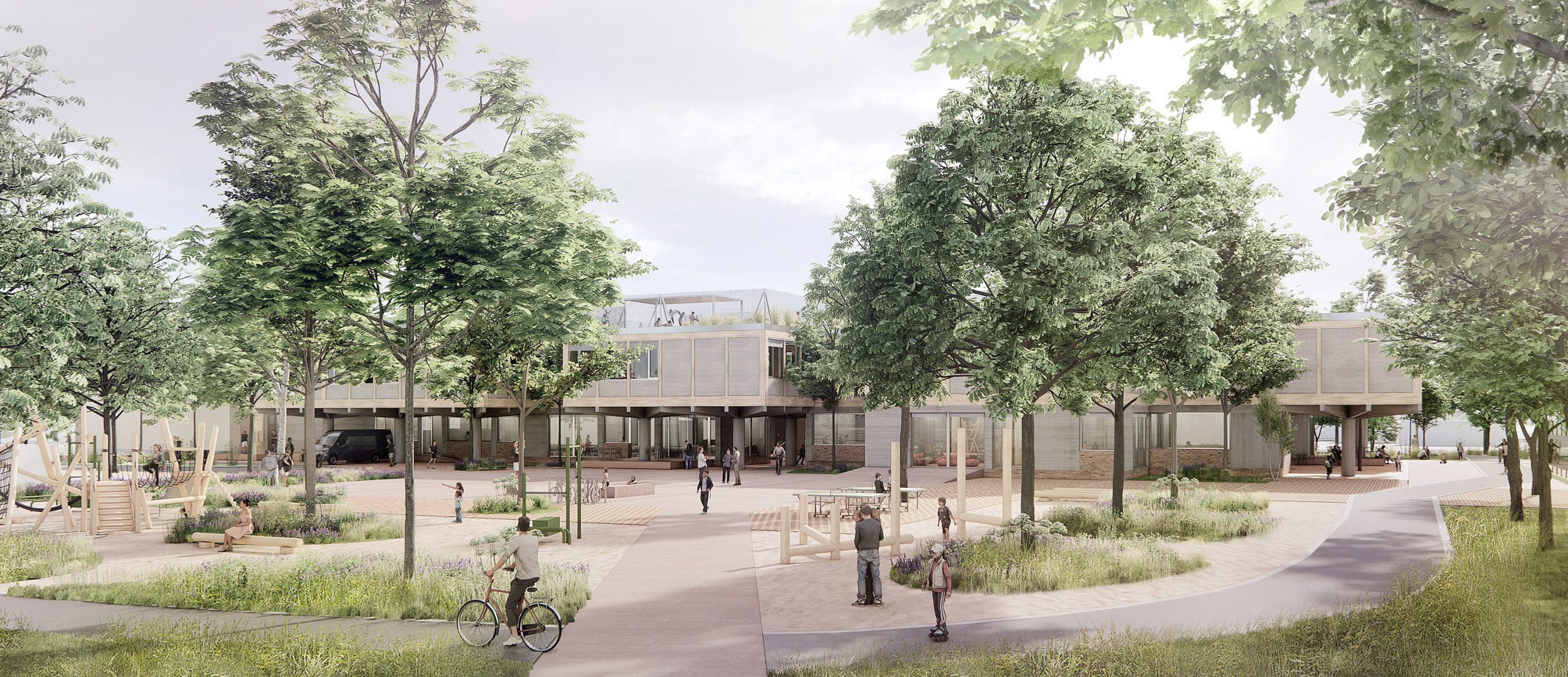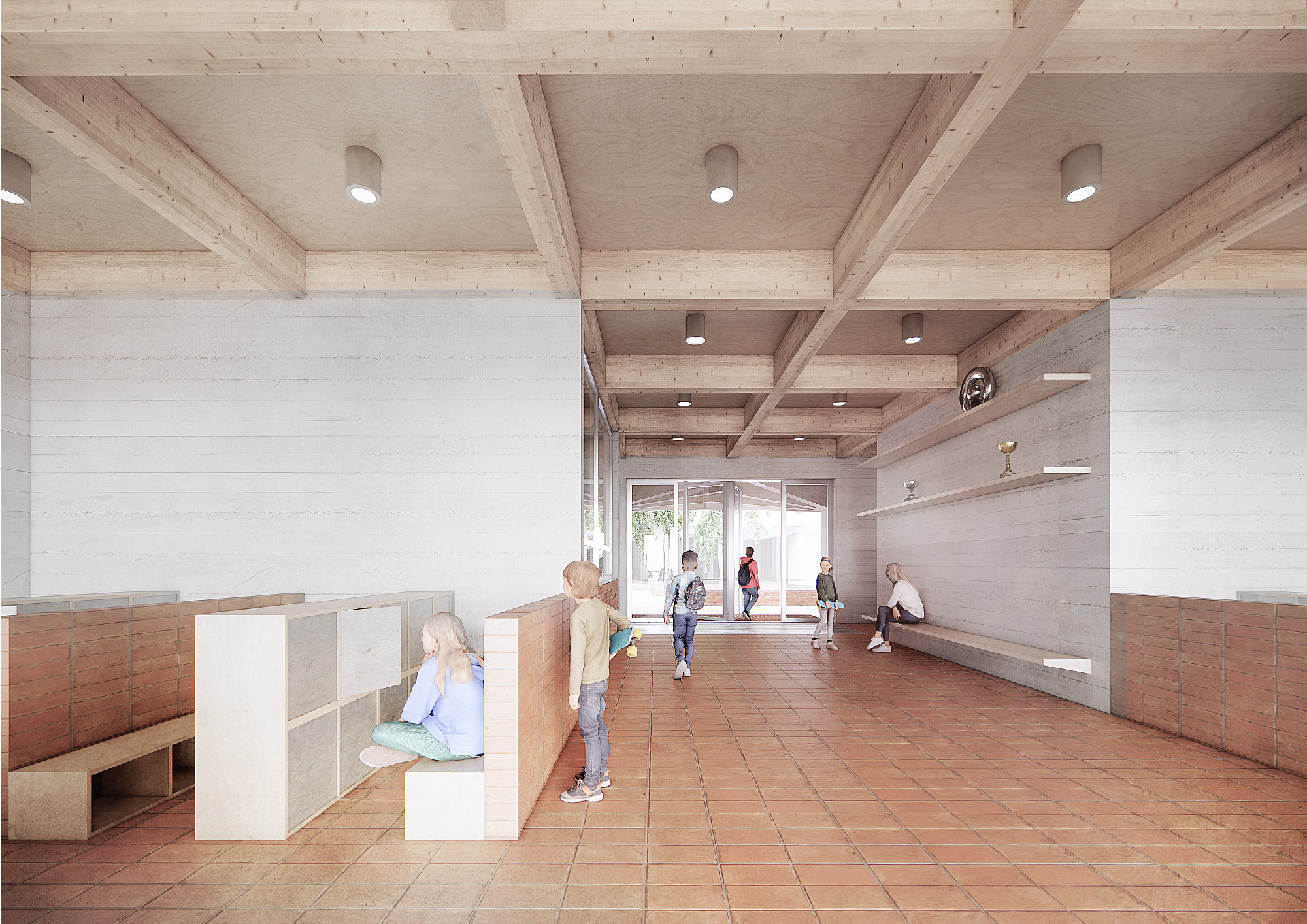 Pokud se má nová škola stát společenských centrem spojujícím obyvatele obce, je důležité, aby se zde každý cítil jako doma, v bezpečí, aby zde každý měl to své místo a to ať preferuje klidnou terasu v zeleni, sdílený prostor auly, či velkolepou dvoranu. Aby tento multifunkční objekt stále fungoval jako škola, musí také nabídnout bezpečné útočiště dětem. Prolnutí těchto aspektů se snažíme docílit vyzdvižením hlavního provozu školy do druhého podlaží a jeho usazením na veřejné a poloveřejné funkce. Potřebu denního osvětlení pro třídy a vytvoření osobitých veřejných prostor k jednotlivým funkcím naplňujeme pomocí tvarové člennitosti stavby. Ta je dosažena díky modulránímu konstrukčnímu systému. Škola, která je sama o sobě je velkým vstupem do menší obce, tak získává příjemné drobnější měřítko. To dobře reaguje na okolní kontext a měřítkově více odpovídá svým primárním uživatelům, tedy dětem.