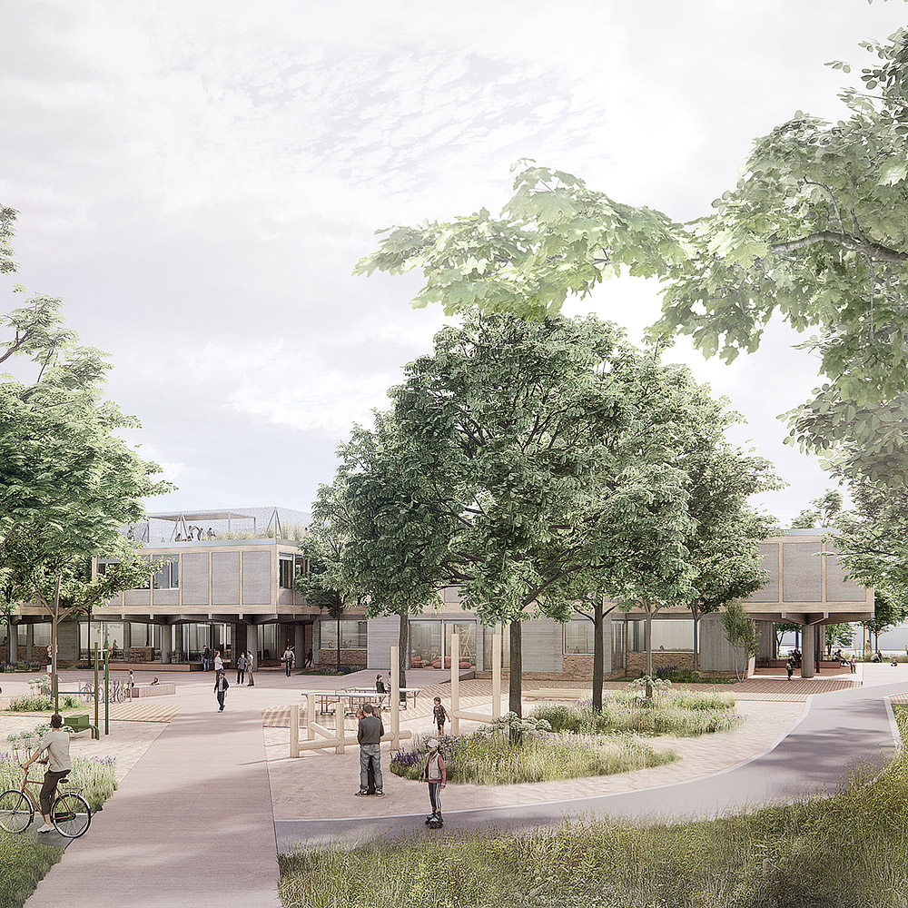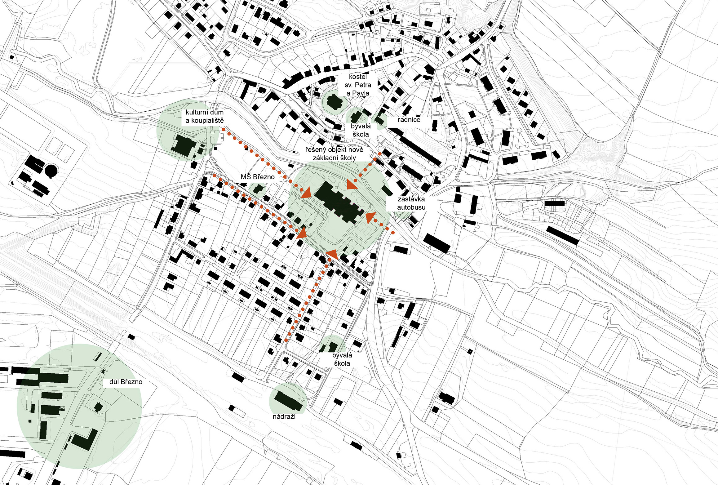 “Nová škola je vznášedlem levitujícím nad nivní krajinou potoka Hutná. Její okolí z jedné strany navazuje na přirozené tvarosloví proudnic potoka, zatímco z druhé na rastrovou zástavbu okolní obytné čtvrti.” Návrh okolí nové školy v Březně vychází z místních podmínek a z pozice pozemku v rámci katastru obce. Pozemek se nachází v záplavové – rekreační oblasti potoka Hutná. Současně přes pozemek prochází přirozená spojnice mezi centrem obce a nádražím. Tato specifika v návrhu zohledňujeme. Nabízíme průchodnost pozemku všemi směry pro veřejnost a současně vytváříme plochy pro pobyt dětí i dospělých. Ploty nejsou v záplavové oblasti vhodné – toto respektujeme a využíváme jako plus celého projektu. Oproti běžné škole má škola v Březně díky své poloze možnost působit otevřeně, transparentně a přitom důstojně v kombinaci s funkcemi pro veřejnost a v napojení na okolní krajinu/přírodu. Vším jako stuha prochází stávající inline dráha, jejíž polohu respektujeme a do návrhu integrujeme. Svou formou škola dělí prostor mezi tenisovým kurtem a tělocvičnou na 3 prostory. U řeky, v těsné blízkosti školy a směrem k nádraží. V prostoru u řeky navrhujeme okolí tak, aby přirozeně plynulo a navazovalo na potok Hutná. Neumisťujeme zde žádné překážky, které by mohly v případě povodně vadit odtoku vody. Vytváříme několik sníženin, které jsou v podloží oddrenážovány směrem k řece a v případě povodní jsou schopny pojmout větší množství vody. Jinak slouží jako chráněná místa aktivit, ať už fitness či herních prvků pro děti. Prostor mezi nimi a stromy je navržen jako méně často sečený druhově pestrý trávník, ve kterém jsou vysekávány cestičky a pobytová místa v rámci sníženin. Prostor samotného potoka zpřístupňujeme bodově a v rámci např. kamenů k přeskákání potoka vedle lávky atd. Kvalita vody dle správce vodoteče není příliš dobrá, přesto je ale hezké vodu přinejmenším vizuálně vtáhnout místně do atmosféry parku. V prostoru kolem školy parter začíná navazovat na její modularitu a rastorovitě přechází v místa, která funkčně navazují na vstupy do budovy – zpevněné povrchy se prolínají s retenčními. V rámci středového atria jsou navrženy dva stromy, které vtahují přírodní element dovnitř dispozice a jejich koruny poskytují pohledovou clonu v úrovni 1.NP. Stejnou funkci pak mají i stromy umisťovány do “nik” mezi jednotlivými třídami. Jejich koruny vytvářejí esteticky zklidňující atmosféru ve třídách a příjemný stín. Směrem k obytné čtvrti a nádraží se rastrovitost školní budovy nevytrácí, ale přirozeně naváže na ortogononalitu pozemků s rodinnými domy. Vytváříme velký shromažďovací prostor, který směrem od školy přechází v měkčí polozpevněný povrch až povrch travaný. Na školním náměstí je možno pořádat větší akce, ať už v rámci školy nebo pro veřejnost. V měkkých částech rastrové “sadové” krajiny jsou pak umístěny herní a fitness prvky (workout, petanque, skate prvky, ping pong stoly). Směrem k ulici pak vše zakončuje travnatý pás a poslední řada stromů. Střecha budovy plní funkci uzavřeného školního dvora, kam je možno děti vypustit bez kontroly a strachu o ně. Nemísí se zde s veřejností. Jsou zde také umístěny 2 venkovní učebny. V rámci střechy jsou v lokálně zvýšené vrstvě substrátu navrženy vícekmenné stromy. Venkovní učebny jsou zastíněny a chráněny proti dešti lehkou konstrukcí. Materiál povrchů směreme od školy změkčujeme. U budovy samotné a v rámci důležitých propojek využíváme velkoformátový červeně probarvený litý beton v rastru dilatačních spar 6,8 m, doplňujeme jej o retenční (betonovou) dlažbu připomínající cihly, přecházíme do MZK, kačírkových, pískových okrových ploch a postupně do zeleně. V rámci diagonálních propojení navazujících na hlavní ulici, propojku od náměstí a na směr k nádraží navrhujeme ponechat litý probarvený beton a tyto směry tak podpořit. Součástí směru do centra obce bychom v rámci litého betonu navrhli i novou lávku, důstojně propojující centrum obce s další veřejně důležitou stavbou, se školou. Tato lávka by pocitově byla součástí propojky a mohla by být zhotovená z probarveného vysokopevnostního betonu (UHPC) jako jeden prefabrikovaný oblouk. Zásobování a příjezd ke škole – ať už osobních aut, hasičů či zásobování – probíhá přes stávající parkoviště na východě řešeného území. Toto parkoviště může být v případě potřeby rozšířeno měkčím avšak pojížděným povrchem a kapacita tak zvětšena. Zásobování jídelny a celé školy probíhá přes plácek u slepé fasády tělocvičny, kde se mohou auta otočit. Celá okolí školní budovy je ale v rámci běžného dne bez aut. Nové tenisové zázemí navrhujeme umístit na jižní straně kurtů, v případě nutnosti je možno k němu zajet autem. Jinak tenisté a ostatní sportovci navštěvující ať už kurty či tělocvičnu parkují na vyhrazeném parkovišti a procházejí přes školní dvůr.